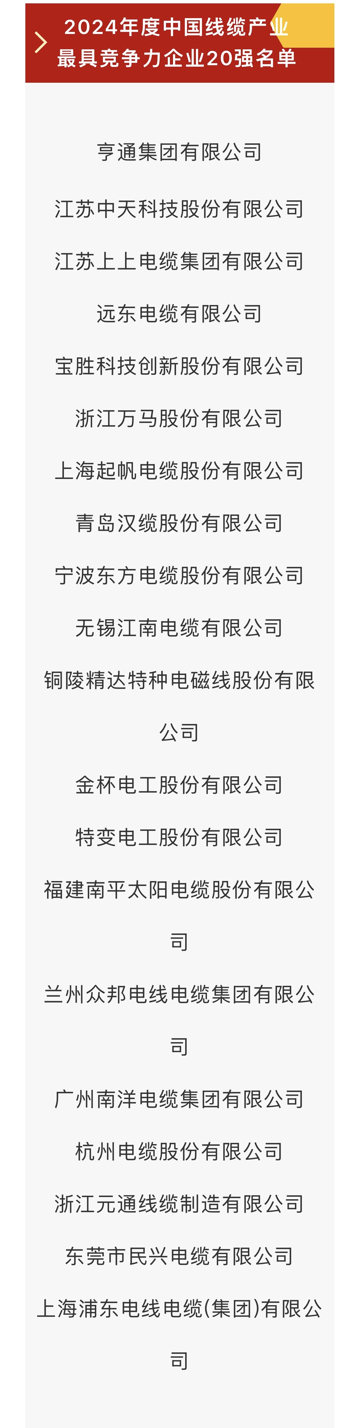1.1 报价人所报电缆品牌必须为上缆所评选的 2024年度中国线缆产业最具竞争力企业百强榜单中的前20名(见图一)。